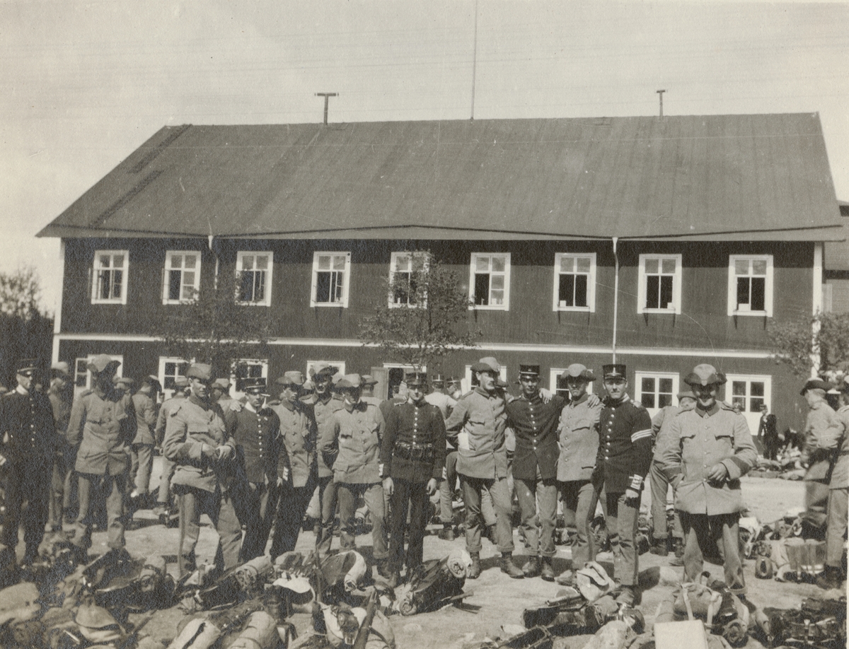 Titel: Gruppbild av soldater från Göta livgarde I 2 framför en stor träbyggnad.
