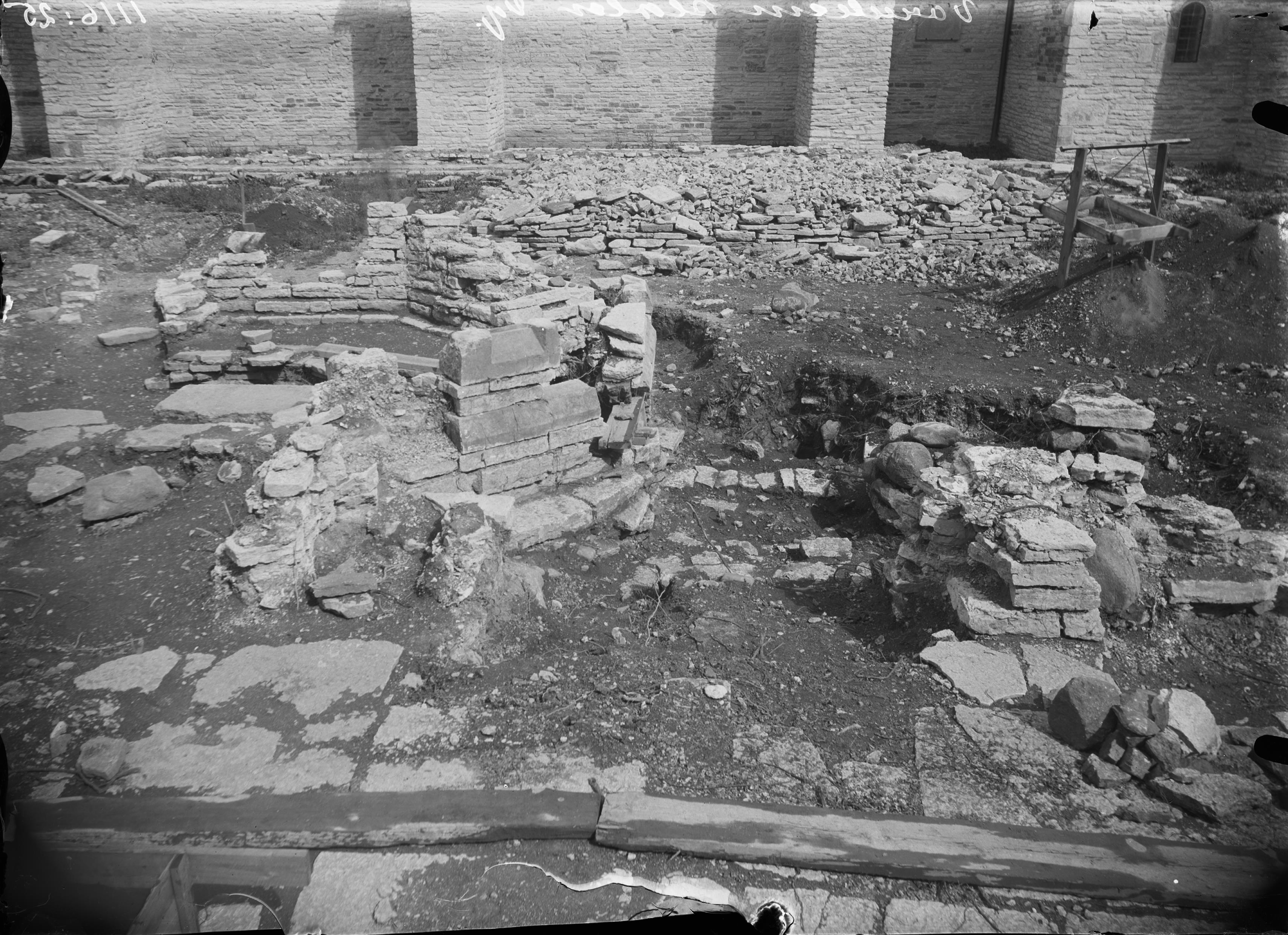 Lavabon efter fullständig utgrävning. Öster om lavabons yttersida rester av stensättning för vattenledning. Från söder.