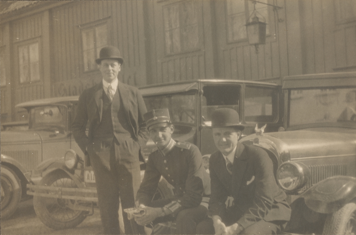 Titel: Två civiklädda män samt en soldat framför bilar.