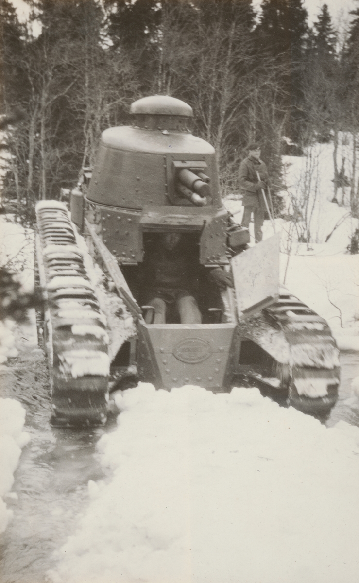 Titel: Stridsvagn av märket Renault korsar en bäck.