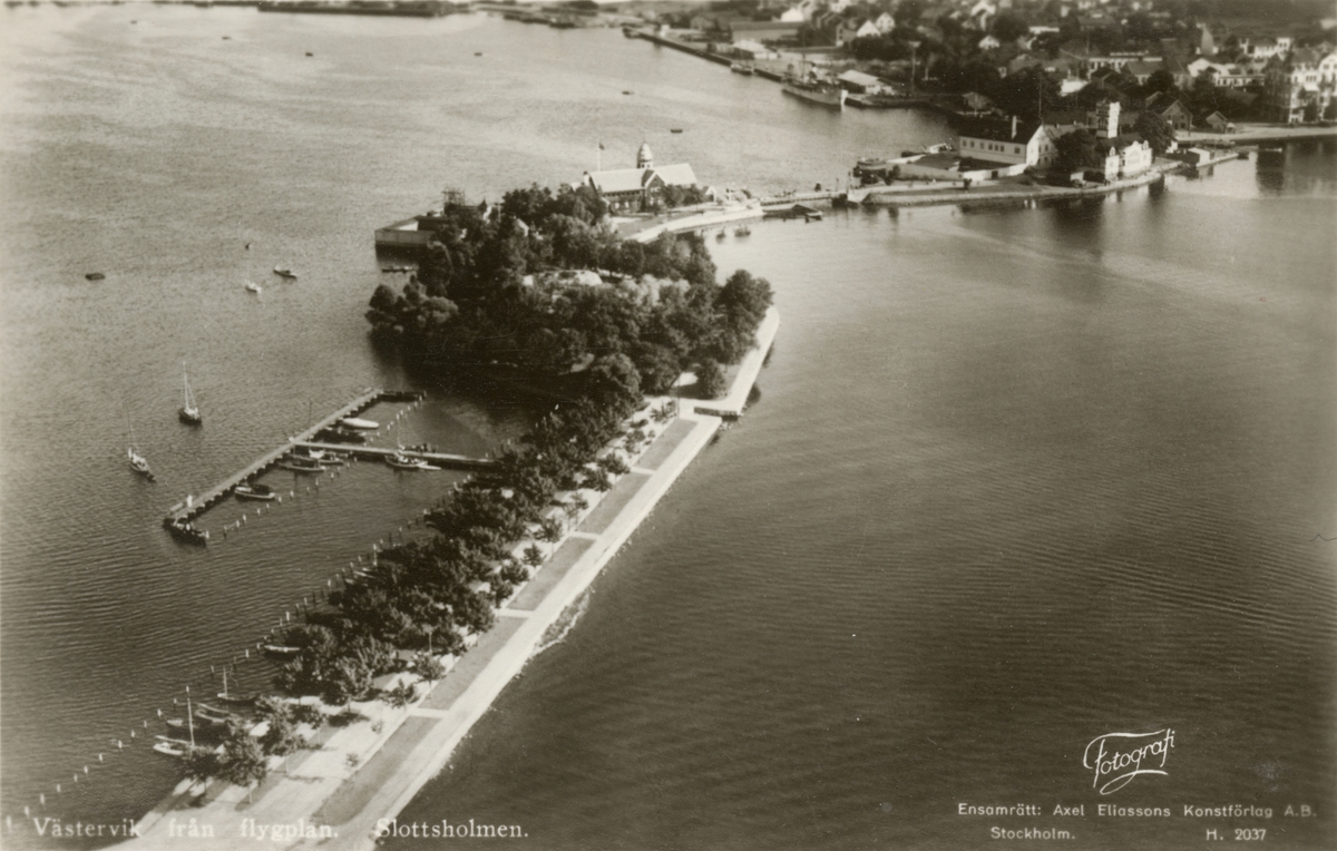 Text i fotoalbum: "Intfältövningar i Västervik. Västervik från flyplan, Slottsholmen".