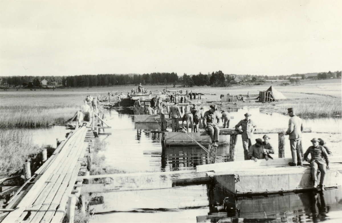 Text i fotoalbum: "Brobyggnad i Storvreta under mötet 1931. Snart började påloken bliva färdiga och då langade vi ut de tunga järnbalkarna, de största vägande 3 ton ".
