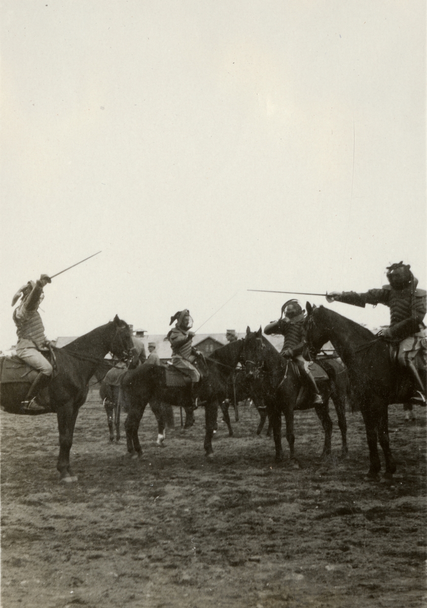 Titel: Text i fotoalbum: "Förbindelsekursen 1920". Fäktövning med soldater till häst.