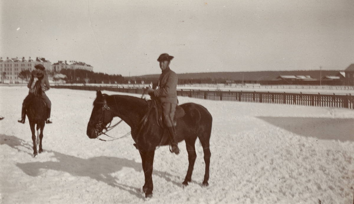 Titel: Malmsten och Wikström på kaserngården efter ridningen.