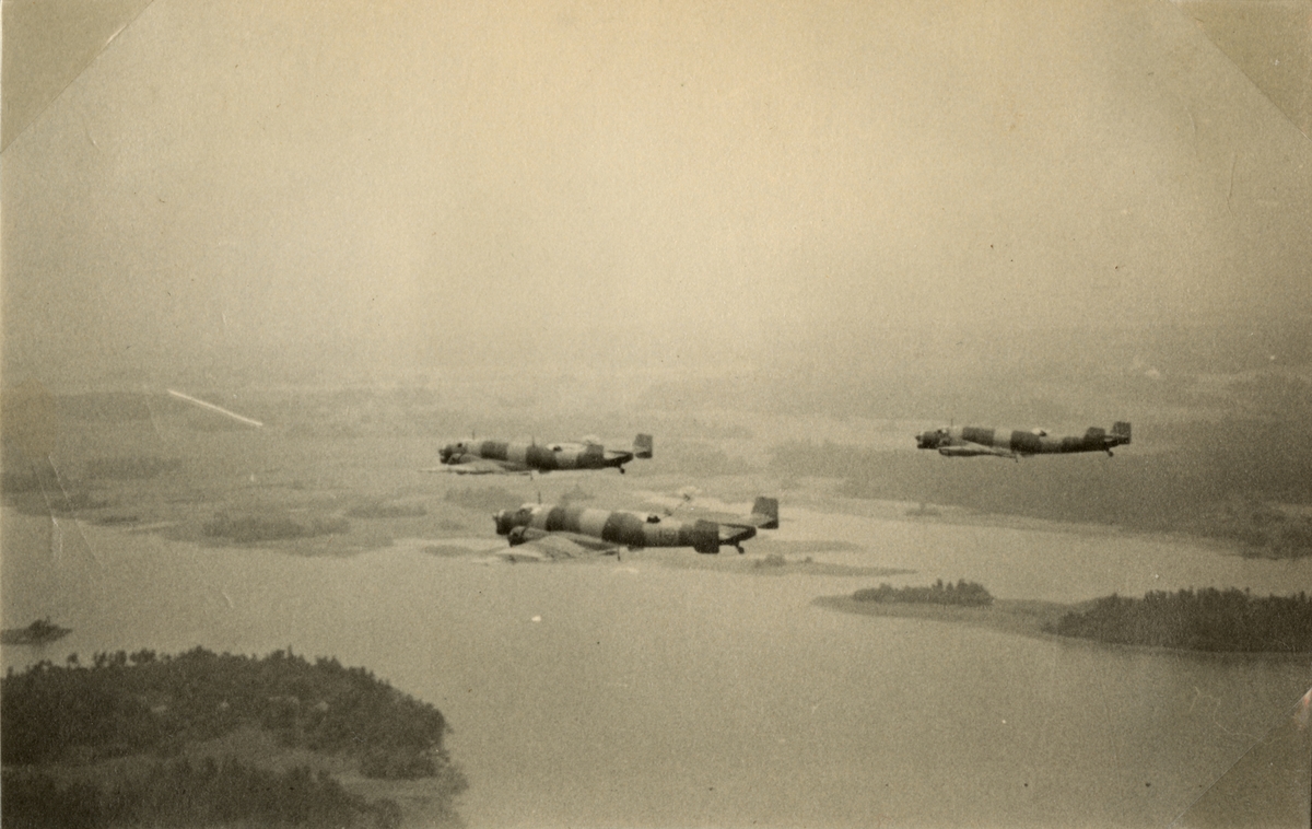 Text i fotoalbum: "Besök vid Västmanlands flygflottilj. Första tunga bombflottiljen är ute på rekogniseringstur."