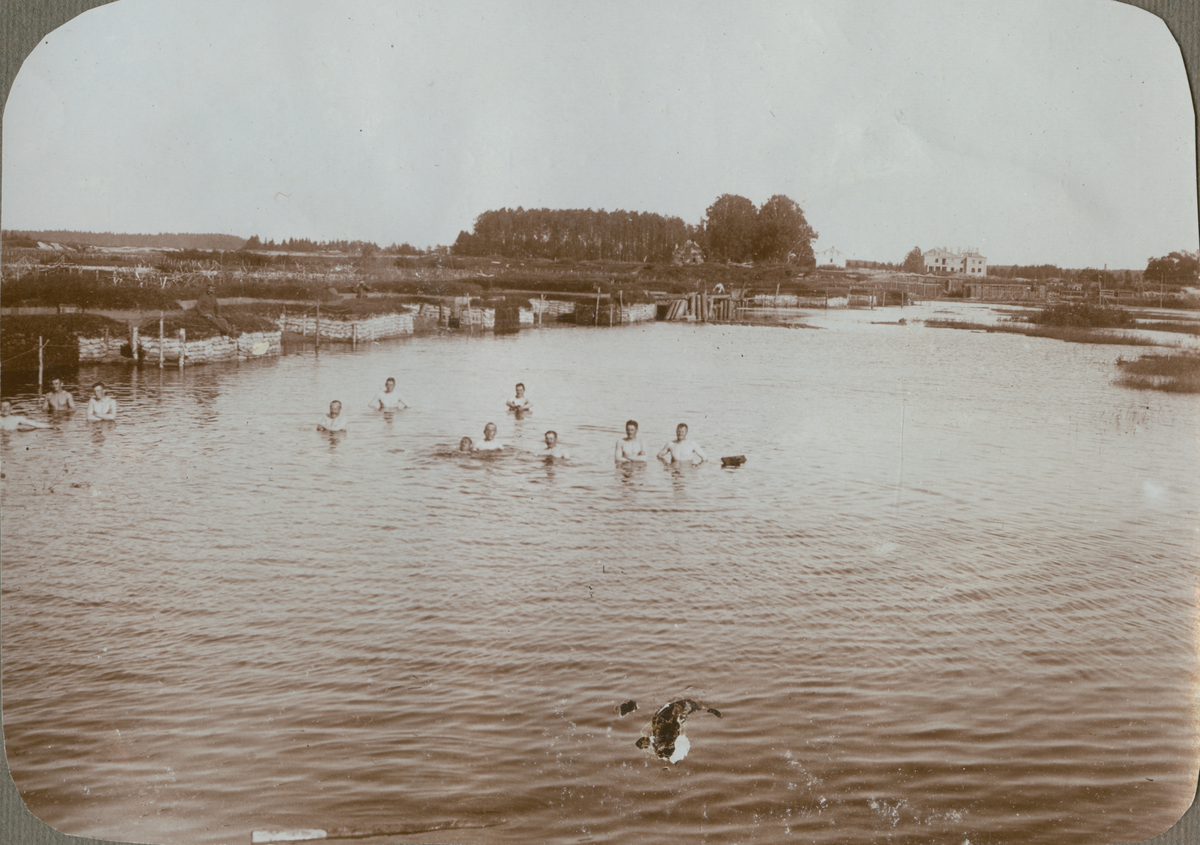 Text i fotoalbum: "Sommaren 1916. Vid öfversvämning badas bakom skyttegrafven, tills några ryska skrappnells gör slut på nöjet."