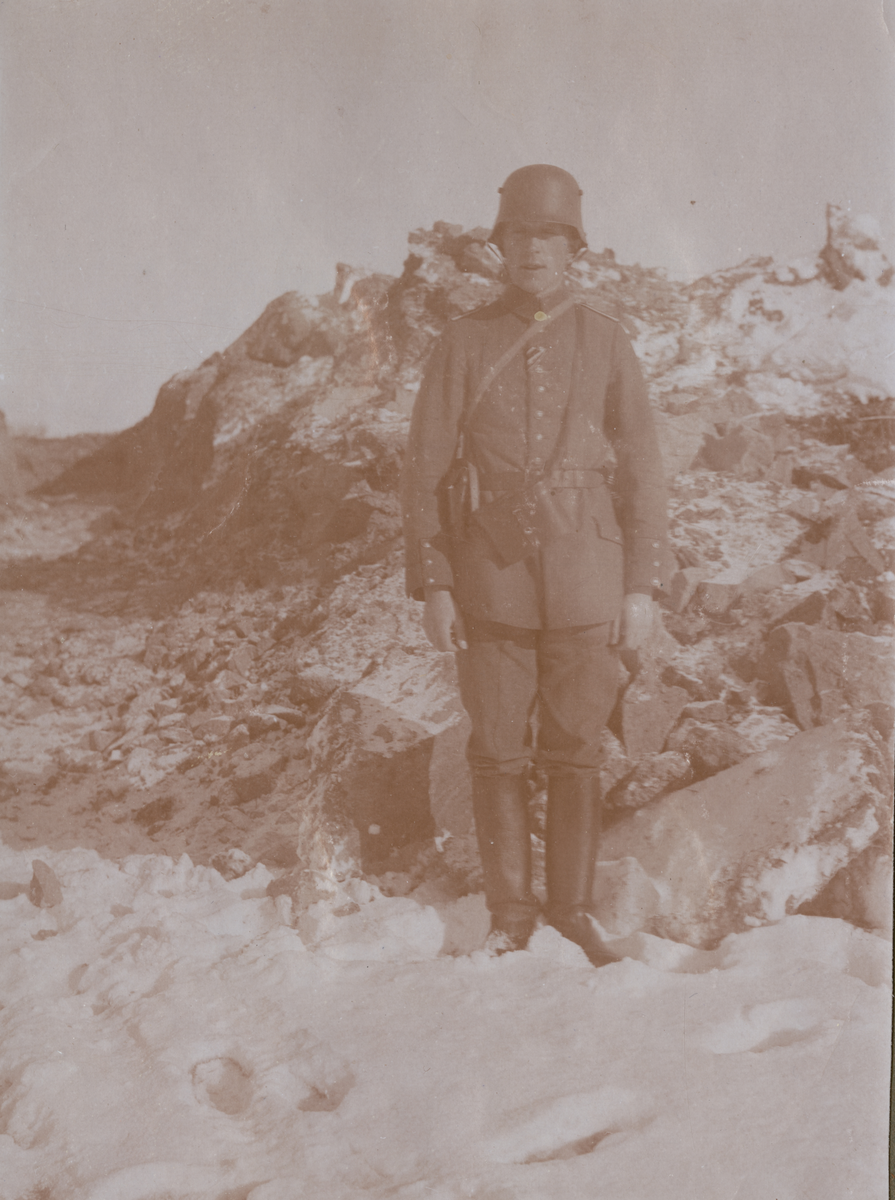 Text i fotoalbum: "Löjtnanten 4/7-1916. Gick först som menige man och sedan som troppförare vid 1sta kompaniet, och förde sedan som kompanichef efterhand alla fyra kompanier inom regementets första bataljon."