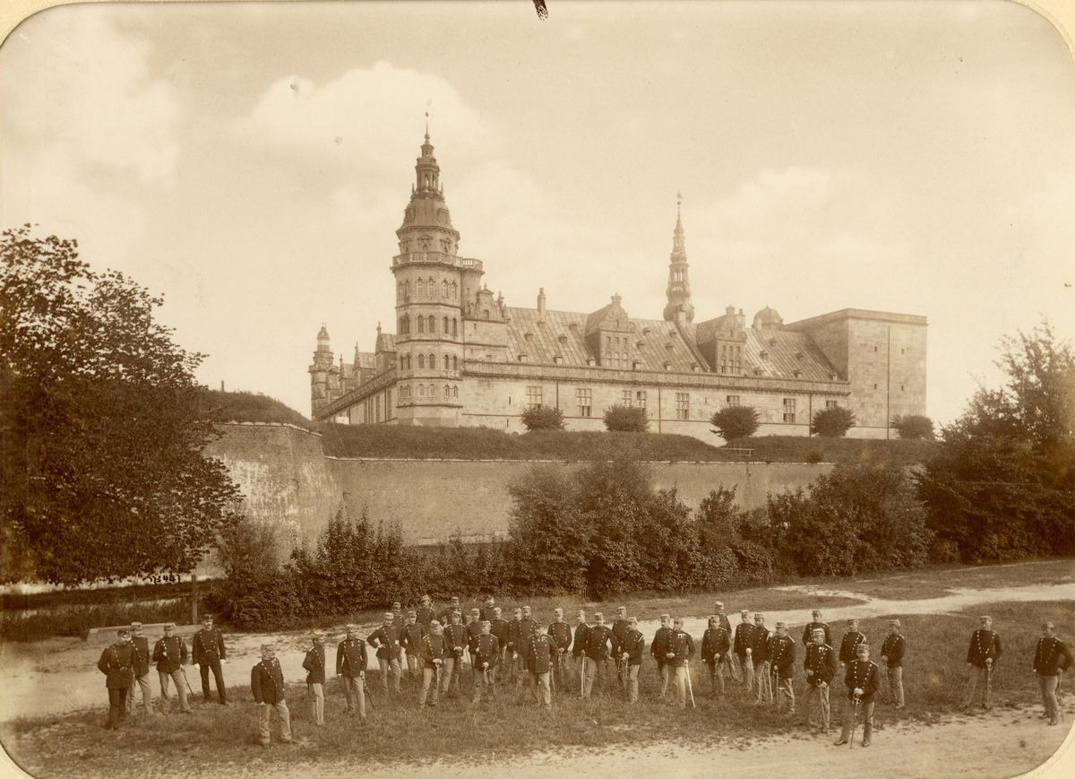 Grupporträtt av officerare från okänt artilleriregemente utanför Kronborgs slottsmurar, 1880-talet.