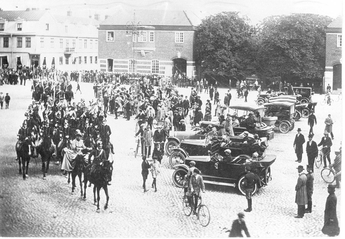 Wendes artilleriregemente A 3 övar högvakt på Stora torget i Kristianstad 1924. Soldaterna iförda uniform m/1872. Civila åskådare med bilar, cyklar och till fot följer övningen.