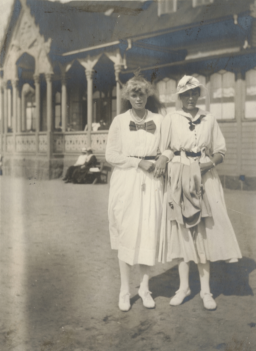 Titel: Två kvinnor utanför Kallbadhuset i Varberg.