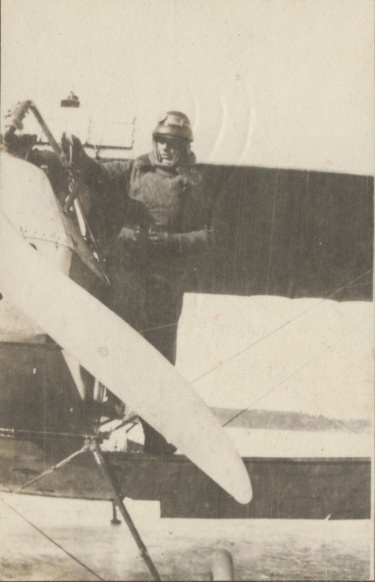 Titel: En pilot klädd i flygdräkt reparerar flygplan.
