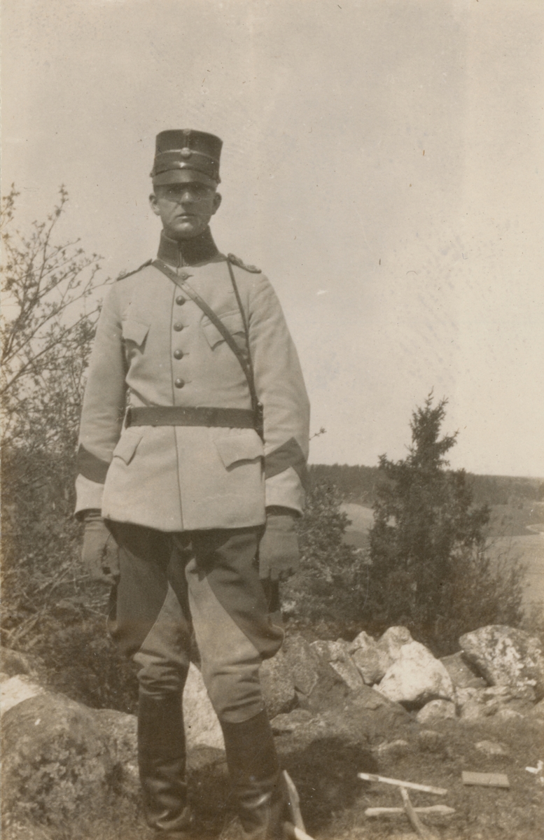 Titel: En soldat från Södermanlands regemente står på en kulle.