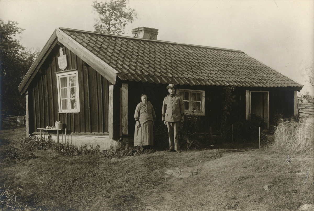 Vicekorpral Karl Oscar Lundin med sin hustru Helga Kristina Karlsdotter utanför sitt soldattorp i närheten av Tranås. Karl Oscar Lundin tillhörde Norra Vedbo kompani, Jönköpings regemente. På bröstet har han en svärdsmedalj. I stugan föddes sju barn mellan 1893 och 1905.