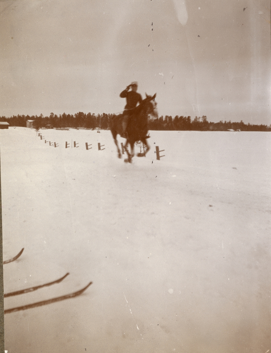 Titel: Text i fotoalbum: "Löjt. Piper kommer in som förste pristage på distansridning vid allmän jubel".