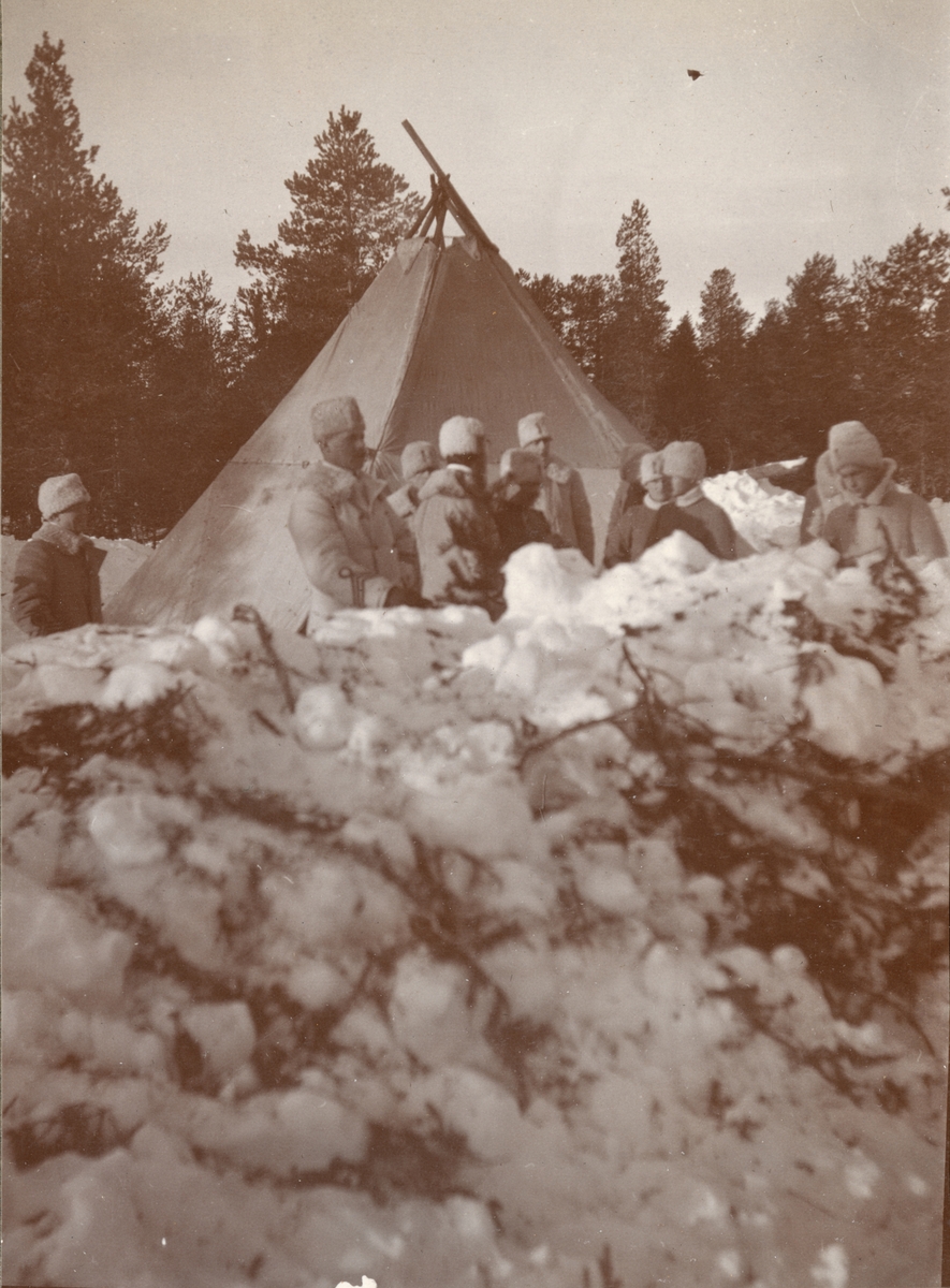 Titel: Text i fotoalbum: "Bivacken ändtligen färdigt vid Djäkneböle".