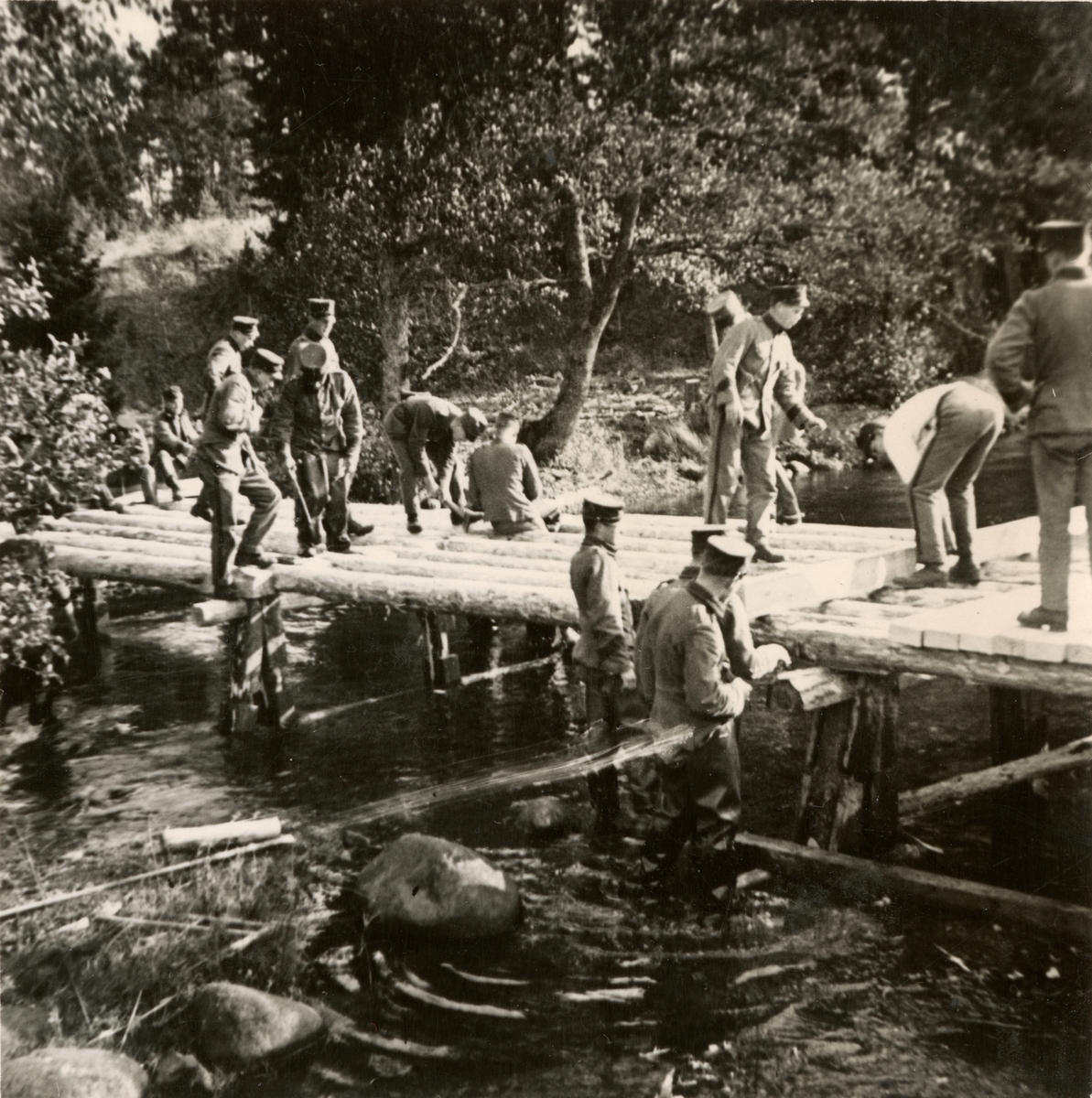 Text i fotoalbum: "Som avslutning på repetitionsövningarna 1935 fick jag med ett kompani bygga en liten landsvägsbro söder om Eksjö vid Qvarnkullen".