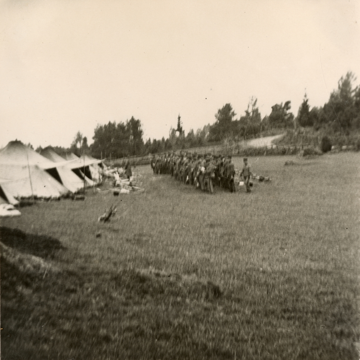 Text i fotoalbum: "Som avslutning på repetitionsövningarna 1935 fick jag med ett kompani bygga en liten landsvägsbro söder om Eksjö vid Qvarnkullen. Lägerplats".