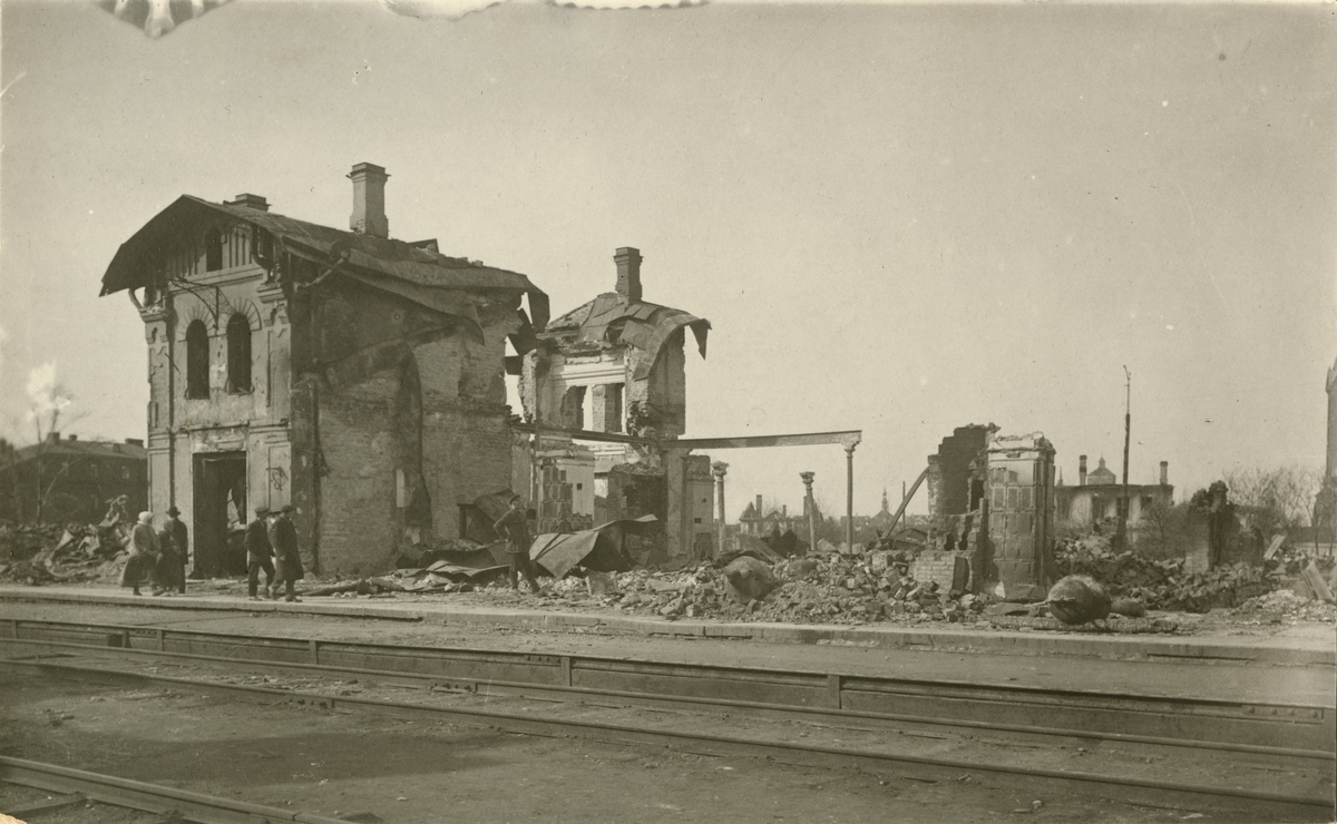 Titel: Text i fotoalbum: "Narva järnvägsstation efter bombardemanget 1919."
