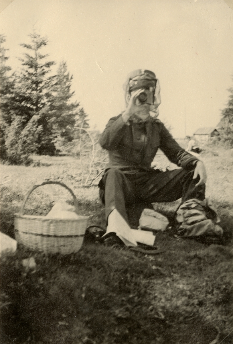 Titel: Text i fotoalbum: "Erhardt. Har besvärligt att sila filmjölk genom myggnätet."