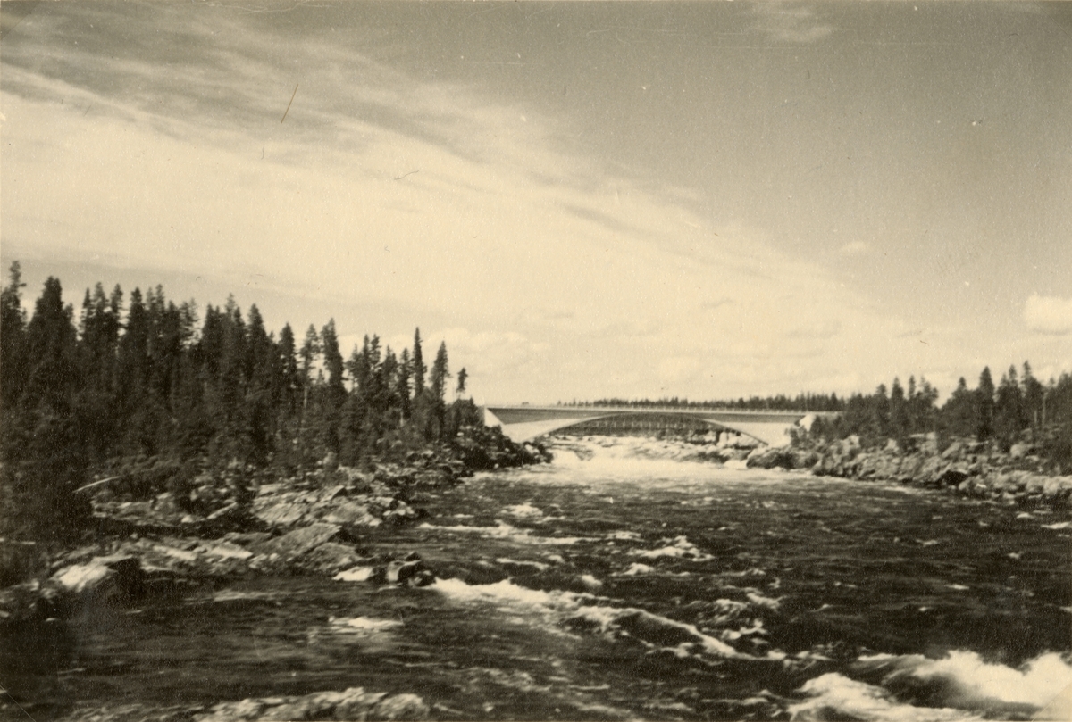 Text i fotoalbum: "16. juli 1938 startade hfk (högre fortifikationskurs) en långresa med inlandsbanan från Östersund till Gellivare. Bron över Luleälv söder Porjus."