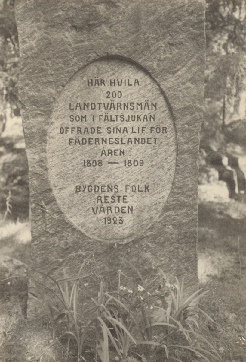 Text i minnesten: "Här hvila landtvärnsmän som i fältsjukan offrade sina lif för fäderneslandet åren 1808-1809. Bygdens folk reste vården 1923".