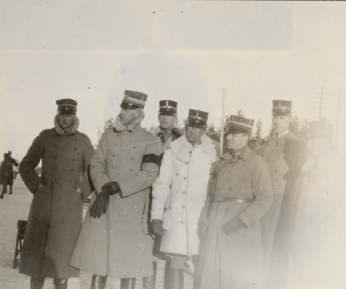 Gruppbild med elever och lärare från stridsvagnskursen vid Göta livgardes stridsvagnsbataljon år 1928-1930 Från vänster: löjtnant Per Kellin Södermanlands regemente I 10, bataljonchef Bertil Burén Göta livgarde I 2, kapten Gösta Bratt Hallands regemente I 16, kapten Fleetwood Göta livgarde I 2 och löjtnant Erik de Maré Dalregementet I 13.