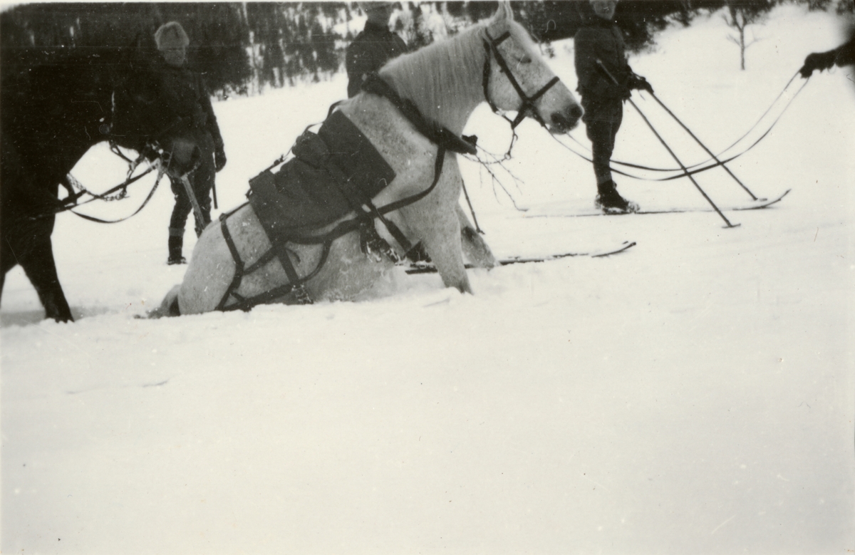 Text i fotoalbum: "Vinterövningarna 1930. Övningsmarsch Björnänge-Kallsjön den 19.-20. febr. Utmattad".