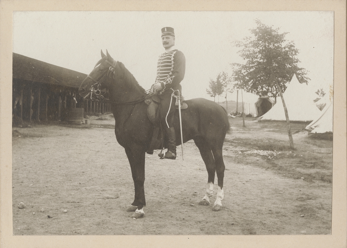 Titel: Fanjunkare Oskar Ferdinand Sundström vid Livregementets husarer på hästen Wadsbo 68 på Sannahed.