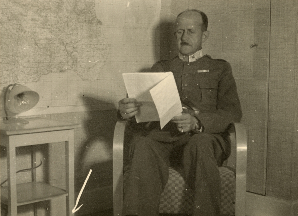 Titel: Text i fotoalbum: "Beredskapstjänst april-okt 1940 vid Fältpost. Chefen General af Edholm".