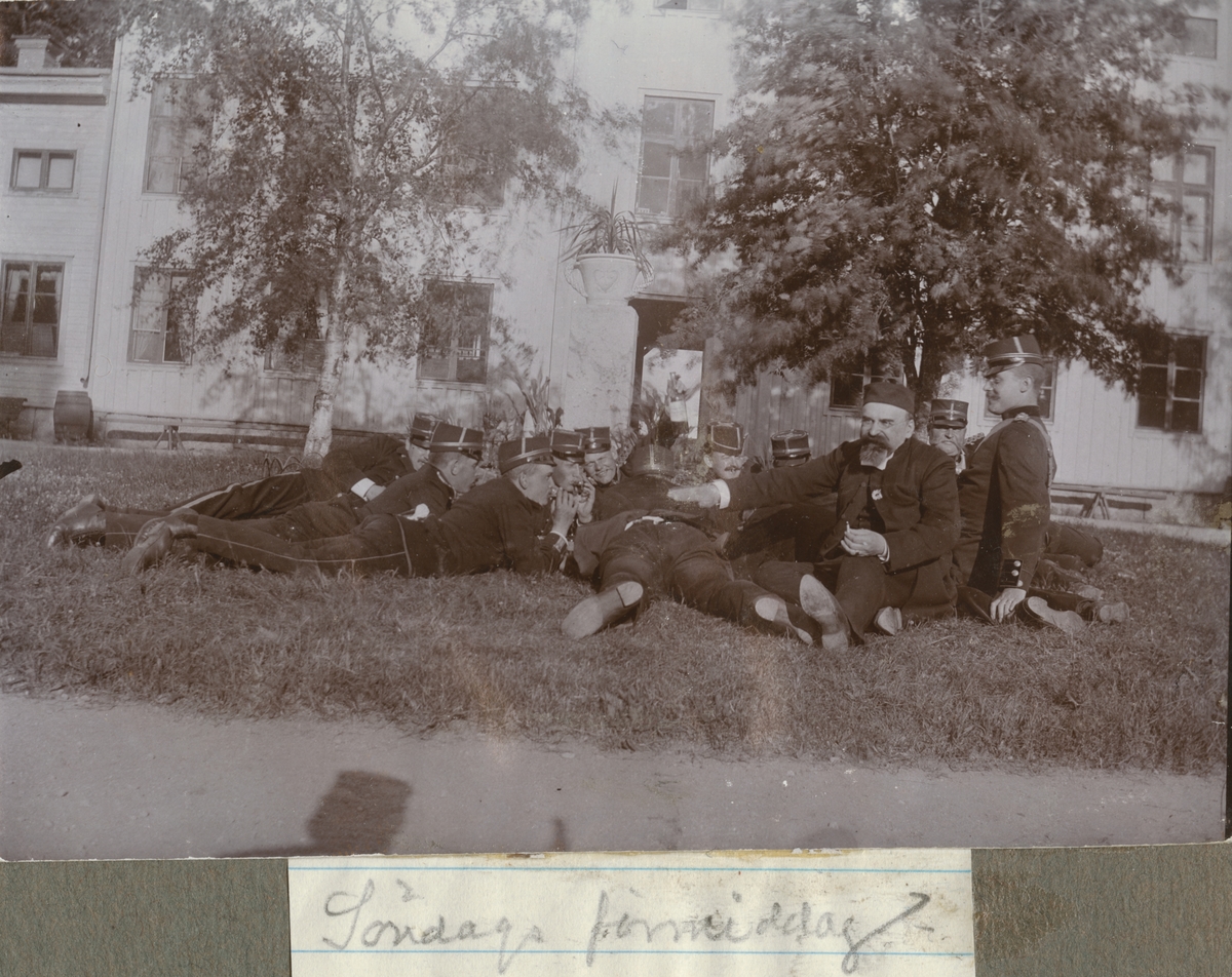 Titel: En grupp soldater kopplar av utanför officersbyggnaden i vid Hälsinge regementes övningsplats Mohed.