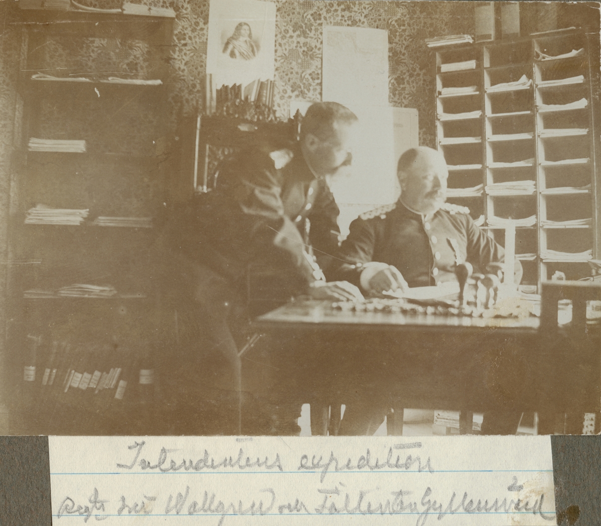 Titel: Kontorsrum med regementsintendent Wallgren och fältintendet Gyllensvärd vid Hälsinge regemente.