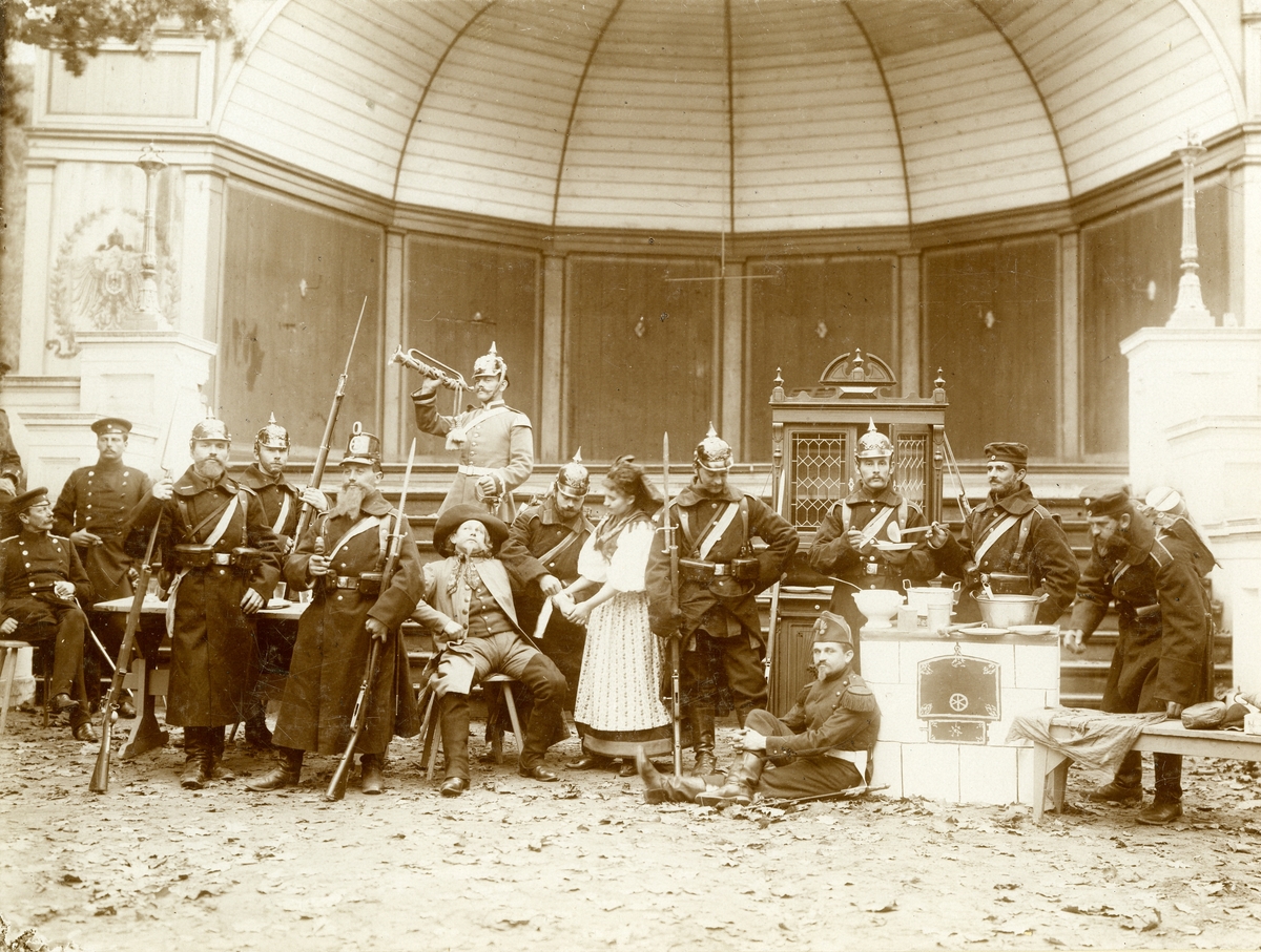 Tysk historisk tablå, grupp i uniformer uppställd vid musikpaviljong, 1900-talet.