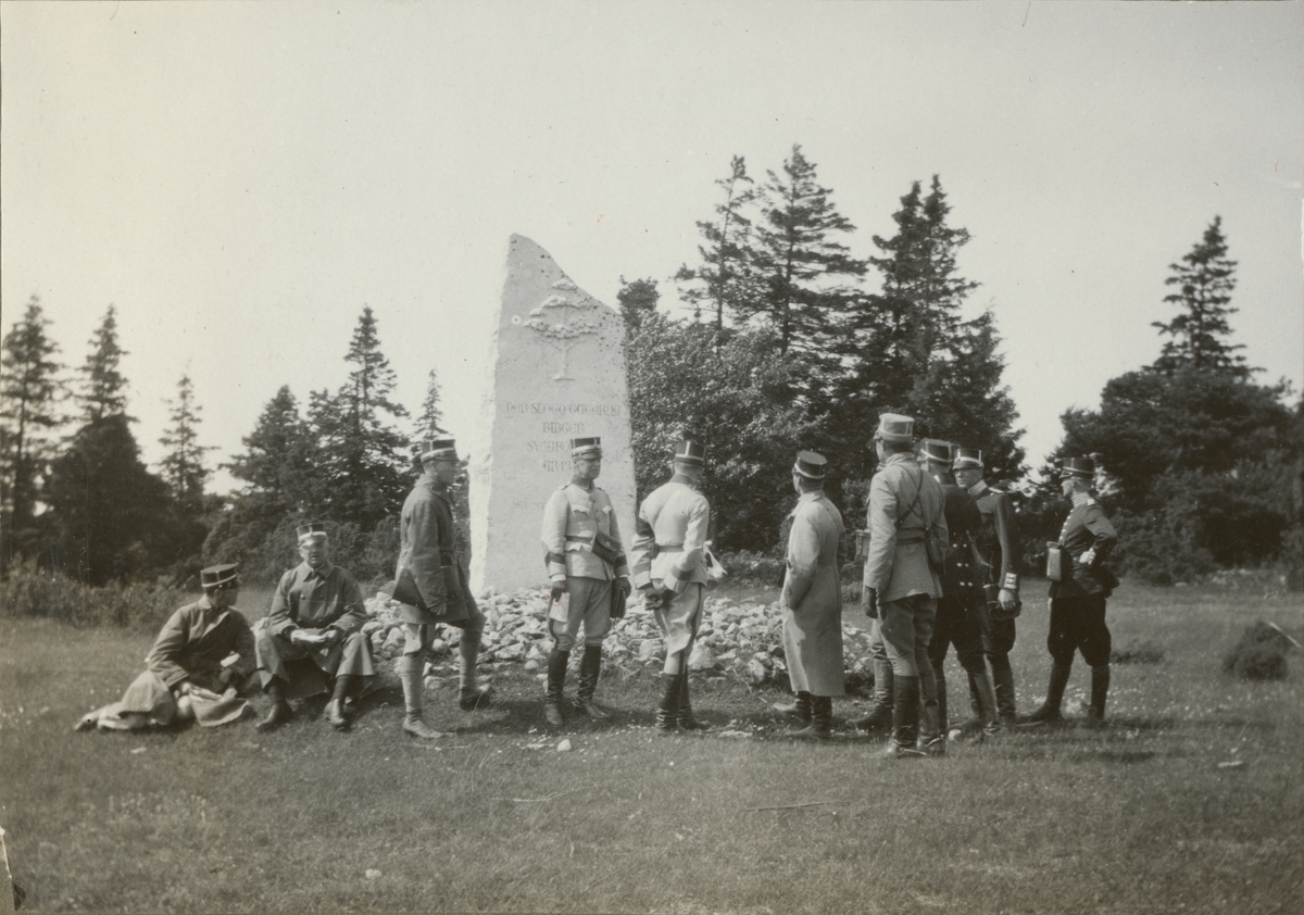 Text i fotoalbum: "I 5:s officersövningar på Gotland den 2.-10. juli 1924". Text i minnesten: "Här slogo gutarna Birger Sveakonung år 1313. Stenen restes år 1913".