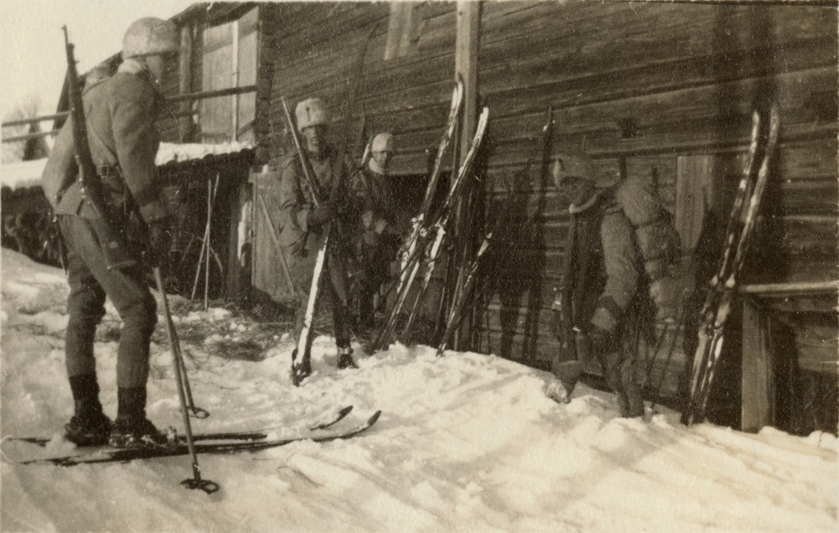 Text i fotoalbum: "De härliga veckorna i Björnänge togo slut och så började en ansträngande vecka i Östersundstrakten där vi deltog i den stora vintermanövren. Rasterna kommo glest".