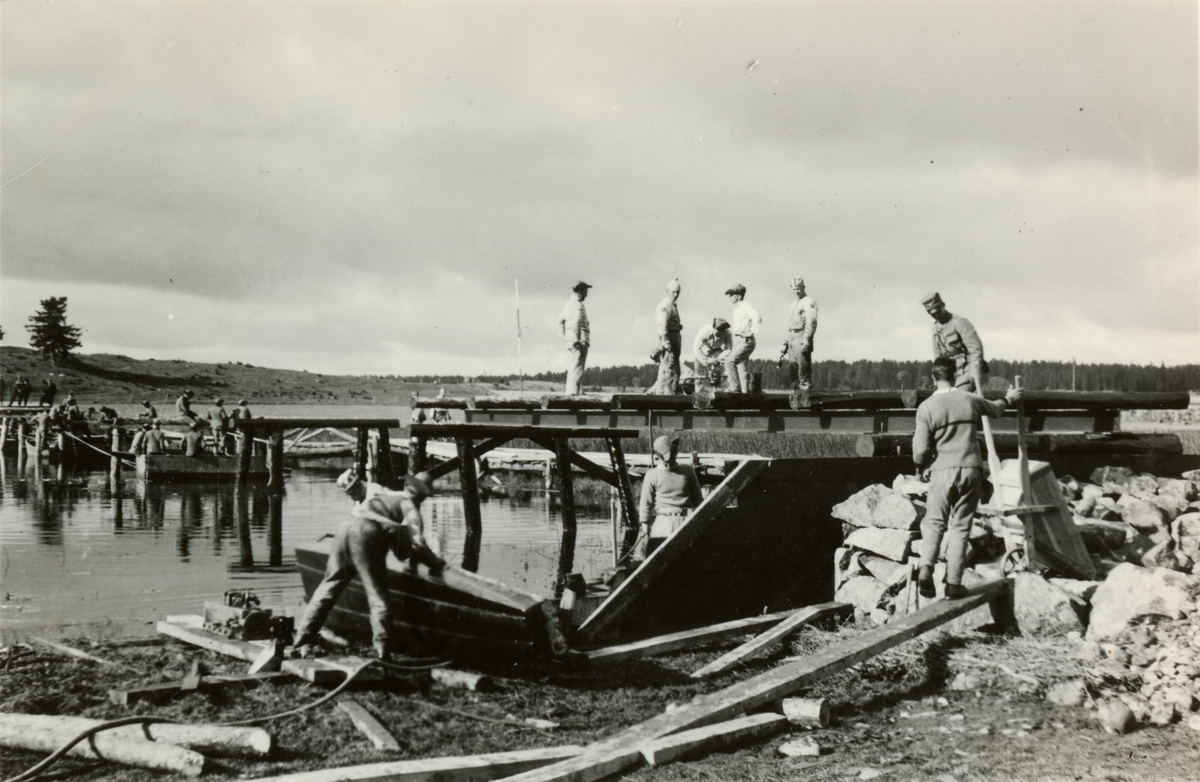 Titel: Text i fotoalbum: "Brobyggnad i Storvreta under mötet 1931. Snart började påloken bliva färdiga och då langade vi ut de tunga järnbalkarna, de största vägande 3 ton ".