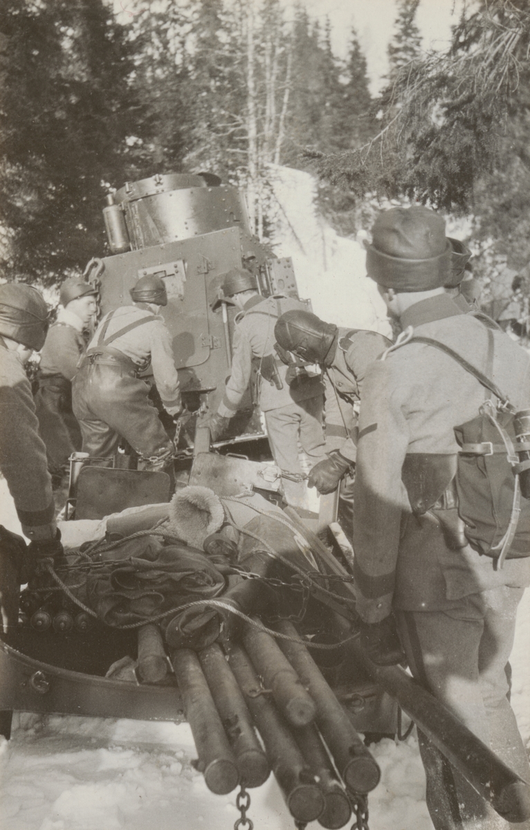 Lastning av stridsvagn m/1921 (eller m/1921-1929). Stridsvagnskursen vid Göta livgardes stridsvagnsbataljon övar i fjällmiljö.