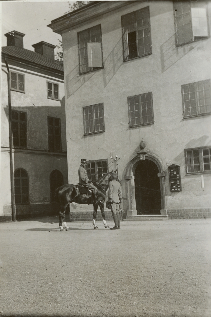 Titel: En officerare på häst möter en soldat utanför Militärhögskolan Karlberg.