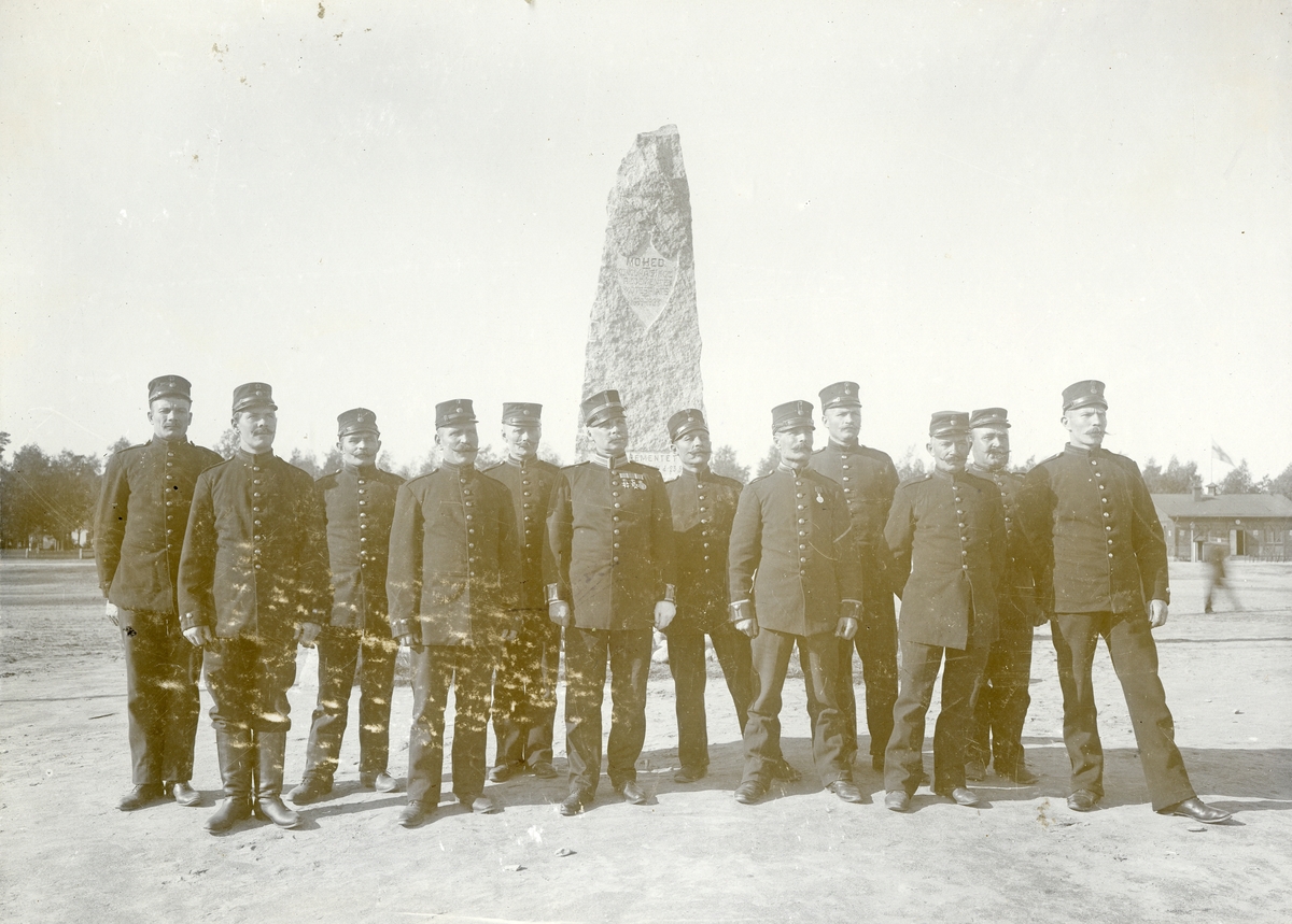 Titel: Grupporträtt av officerare från Hälsinge regemente I 14 vid vid minnessten på Mohed.