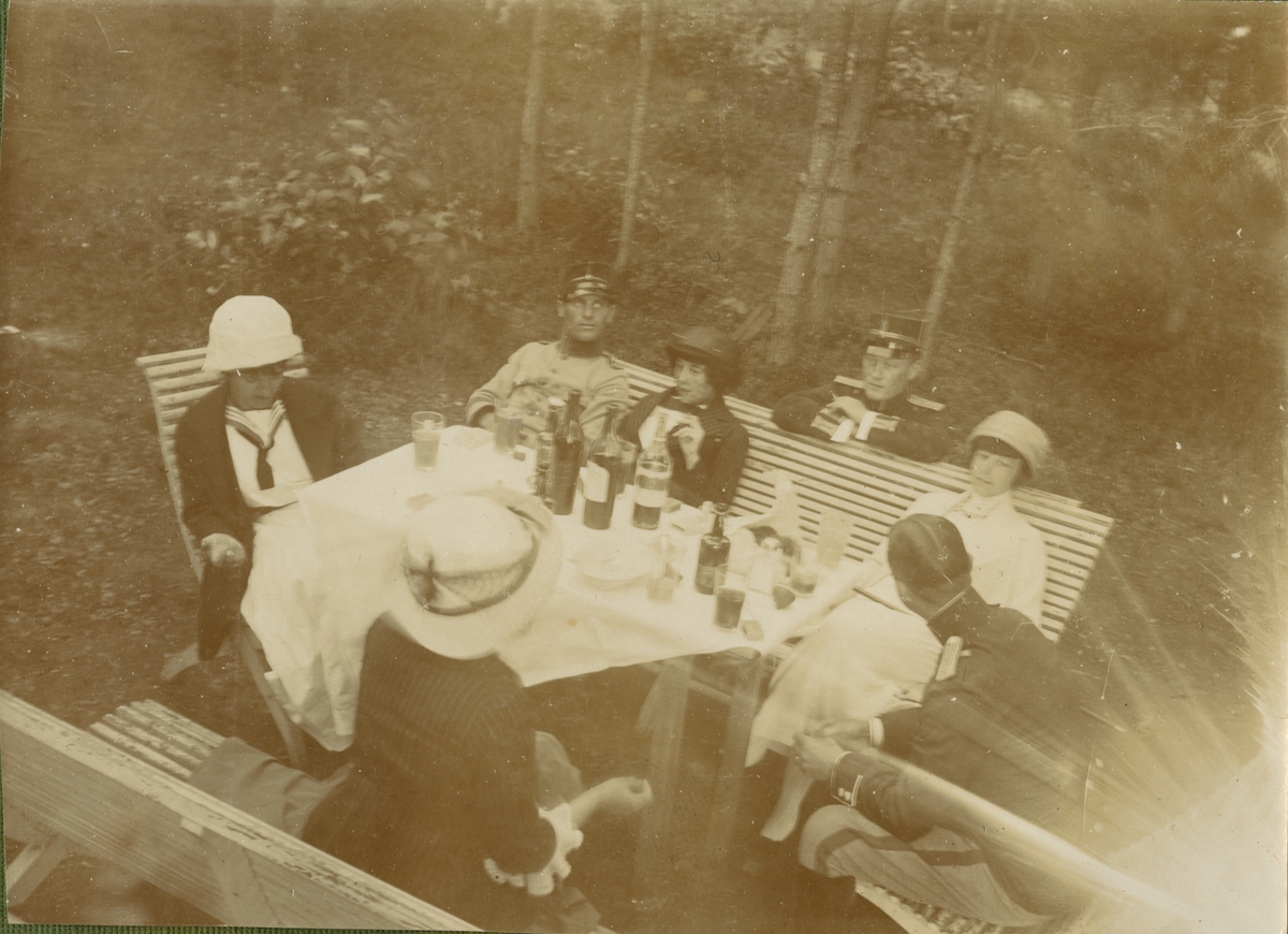 Titel: Sällskap avnjuter förfriskningar i trädgården.