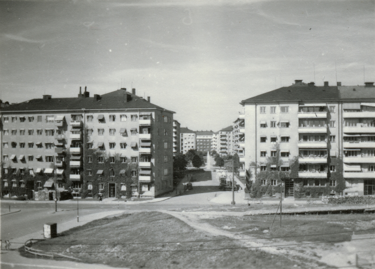 Titel: Text i fotoalbum: "KAFI DB (=Kungl. Arméförvaltningens Driftsbyrå). Utsikt från DB fönster".