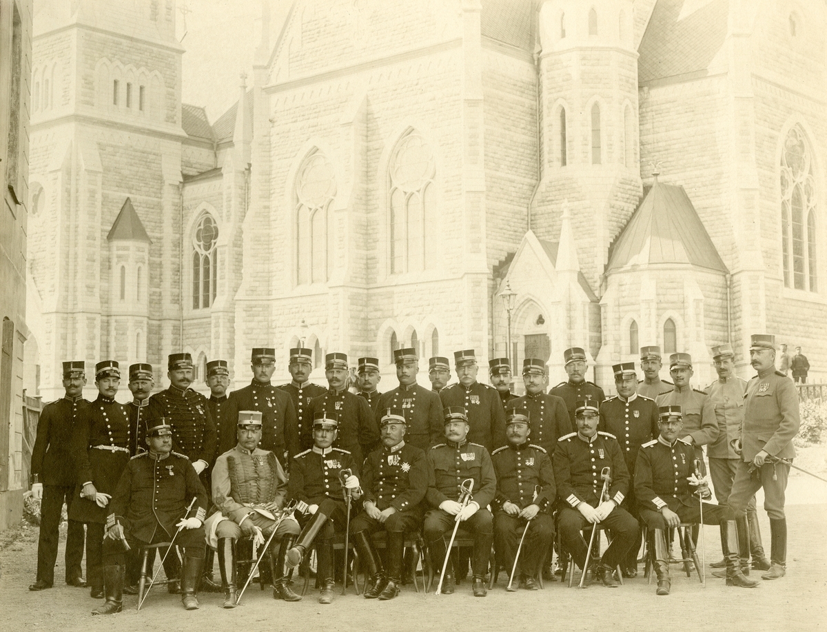 Grupporträtt av officerare stående och sittande utanför Oskarskyrkan.