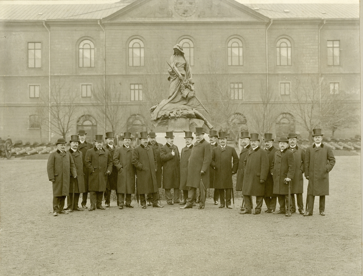 Titel: 1885 års karlbergskurs samlad utanför Armémuseum vid Poltavamonumentet 1905.
