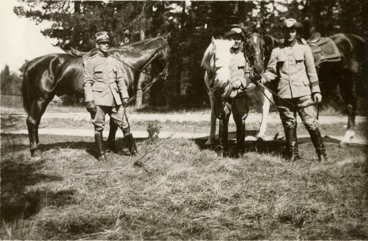 Text i fotoalbum: "Officersaspirantskolan 1925-1926. Ridutbildningen blev i början en svår stötosten, men så småningom blev man mer eller mindre sadelfast. Skolch m. fl.".