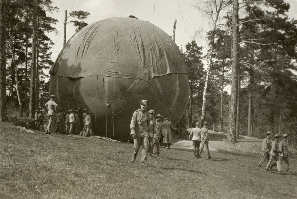 Titel: Elever från Krigsskolan Karlberg under luftballongövning.