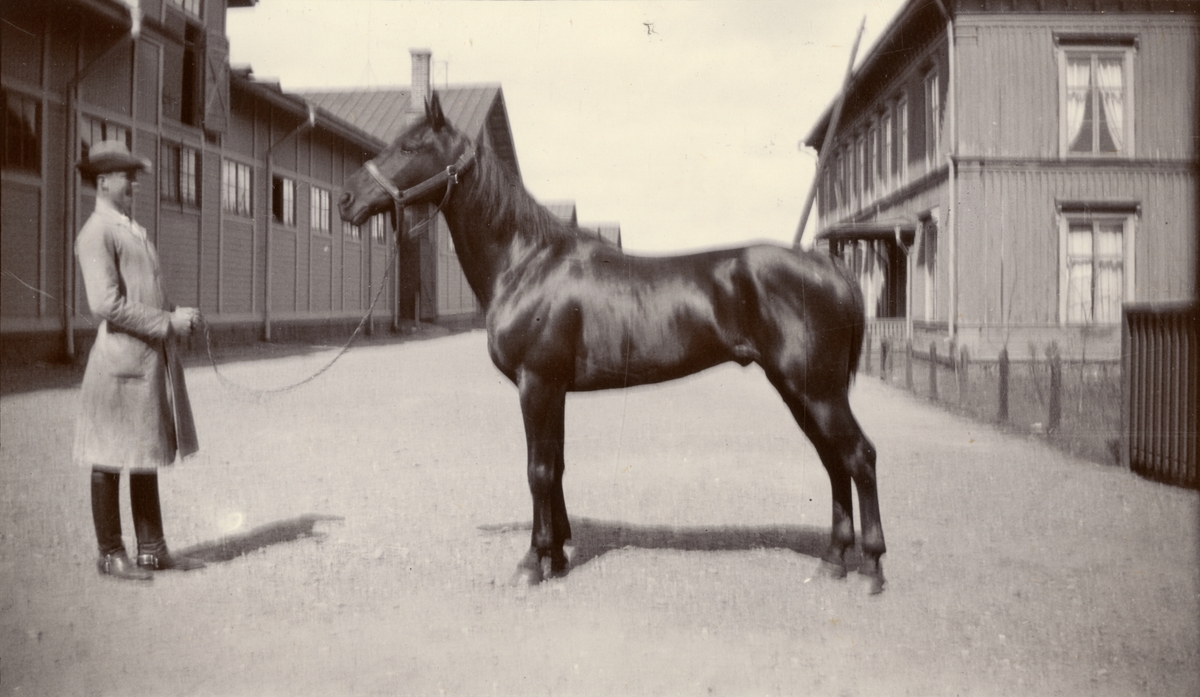 Titel: Berglund vid Smålands husarregemente K 4 med häst.