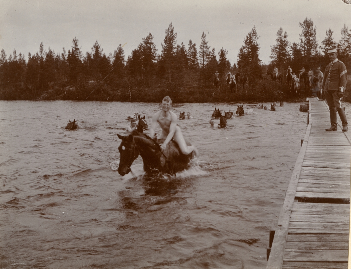 Titel: Elever vid Kavalleriskolan i Umeå simmar med hästar i Piparbölesjön.