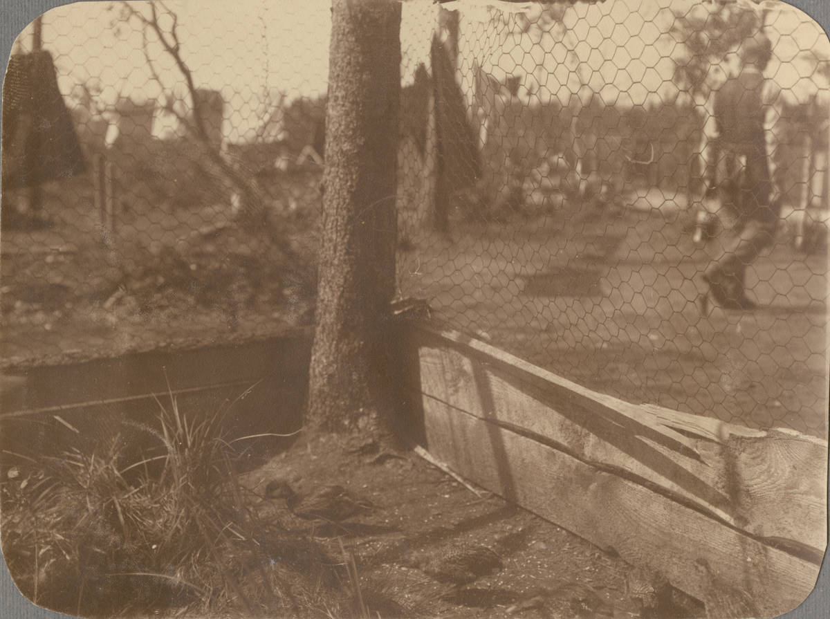 Text i fotoalbum: "Augusti 1917. Mina and- och orrkyklingar, infångades 2 dagar gamla, uppmanades på spiseln, matades med myrägg, blefvo så tama att de hoppade upp på min hand och arm. Utsattes flera gånger för attentat af ryska granater."