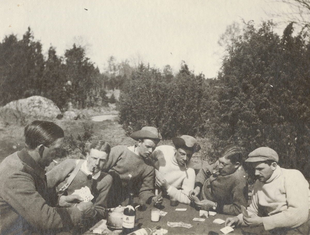 Titel: Soldater från Göta livgarde I 2 spenderar fritiden med att spela kort ute i naturen.