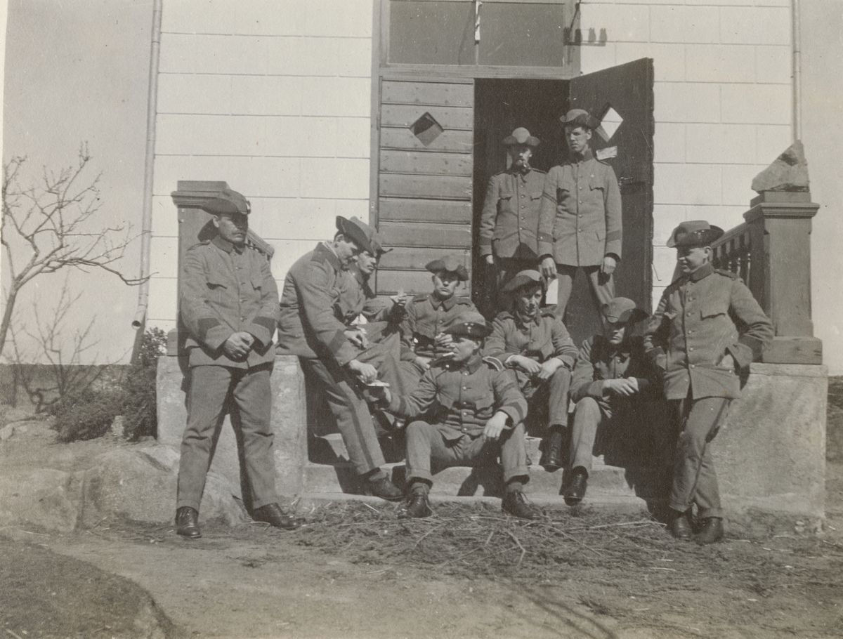 Titel: Gruppfoto med soldater från Göta livgarde I 2 framför ett trähus.