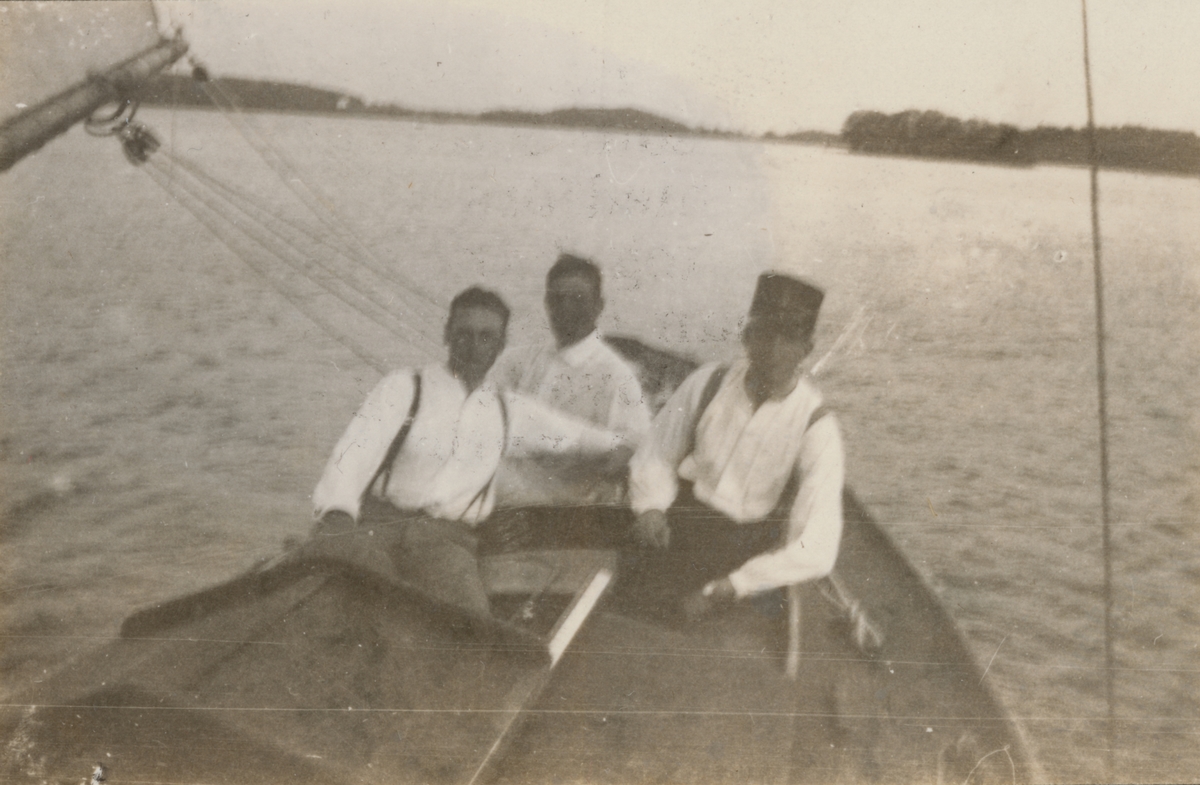 Titel: Tre män i segelbåt. I bakgrunden syns en holme och strandlinje.